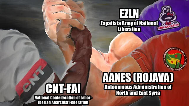 In the time after the Spanish Revolution’s defeat, anarchism suffered a massive blow as fascist and authoritarian regimes crushed revolutionary movements as Anarchists were hunted, imprisoned, and executed. The later Red Scare forced many underground or into exile while revolutionary trade unions were co-opted or dismantled. By the 1980s, the movement had shifted towards individualist and insurrectionary tactics, which struggled to build sustained power in the face of rising neo-liberal capitalism. Despite this, anarchists persisted in anti-colonial struggles, labor movements, and anti-fascist organizing, resisting both state repression and authoritarian leftist dominance imposed by the shadow of the USSR. In recent years, anarchism surged back into mainstream after the Occupy movement repopularized anarchist tactics like direct action, mutual aid, and direct democracy with consensus decision-making. Today Anarcho-Communism is the most widespread and influential anarchist current and is represented in countless worldwide anarchist groups and regional federations. These federations often also represent anarchist liberation movements like Anarcha-Feminism or Black Anarchism. Now, more libertarian socialist organizations are emerging worldwide, actively engaging in union organizing, building community councils and fostering cooperative networks. Through this the anarchist movement has been strengthening collective power from the ground up, making solidarity and mutual aid the backbone of our movement. Besides the specific anarchist movement other libertarian socialist projects have emerged, such as the Zapatista Autonomous Municipalities in Mexico, where communities built a bottom-up autonomous-council alternative to state control with recallable delegation etc. based on an anarchist outlook with a heavy focus on indigenous rights called "Neozapatismo." Despite operating under the constant pressure of a hostile state and neoliberal global order, the Zapatistas have achieved remarkable gains in their autonomous region like decommodification, food sovereignty, collective health care, and self-determined education, demonstrating what is possible through sustained, revolutionary anarchist practices. As another example, in the most difficult of conditions of Syria, the Autonomous Administration of North and East Syria(Rojava) based on "Democratic Confederalism" has experimented with radical gender equality initiatives, and decentralized self-management based on grassroots community councils amid the Syrian Civil War. Rojava’s economy operates on a decentralized, collectivist model, with over three-quarters of property owned by workers through local communal planning, workers’ councils, co-operatives, and unions. Co-operatives play a major role in agriculture and are active across construction, manufacturing, and energy sectors, while workers’ councils oversee more than a third of overall production. While facing ongoing conflict and discrepancies in their revolutionary project due to many limitations, these efforts reflect a broader libertarian socialist momentum in Rojava leading toward horizontal and emancipatory structures, from which the anarchist movement itself can draw important lessons. Amidst all of this, the anarchist movement is reemerging as a relevant revolutionary force on the international stage again, offering tangible alternatives to the current crisis of capitalism, state and ecology through building collective power on the grassroots level and opposing fascism at every step.