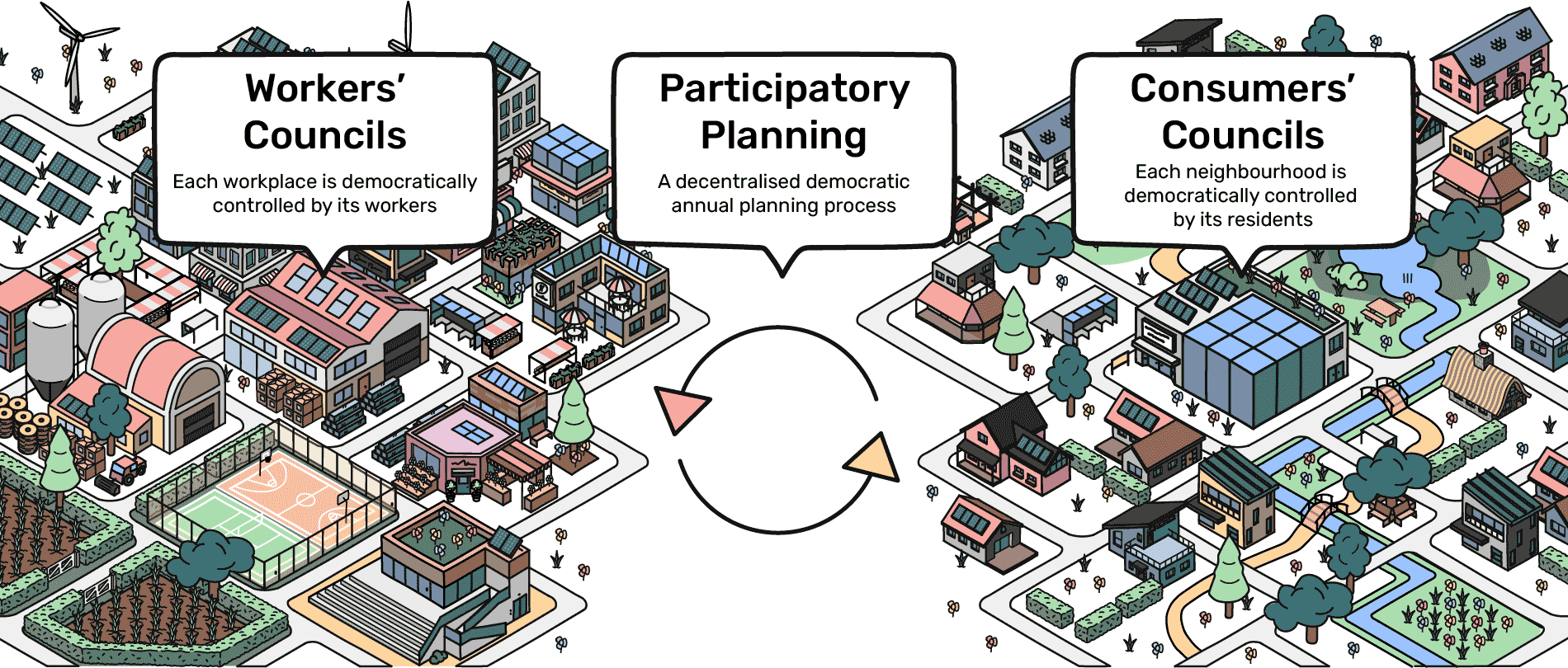Anarchist reject any kind of state system no matter how "free" or "democratic" it proclaims to be. For example anarchists oppose "liberal democracy" because of its hierarchical and capitalist nature. "It proclaims freedom of speech, of the press, of association... In reality, all these freedoms are of a very relative nature: they are tolerated as long as they do not contradict the interests of the ruling class". It enshrines class structures, granting the capitalist class control over the economy, while economic power functions as political power, allowing the capitalist class to shape policy, representation, the press, and education. Its hierarchical institutions protect politicians from accountability, which in practice makes "liberal democracy" a dictatorship of the ruling class.In contrast, anarchists call for the complete self-management of society. In an anarchist society decisions are not imposed from above but will be made collectively through the "Council System" also referred to as "Free Soviet System."(Soviet meaning workers' council.) Councils are the self-organization of the people themselves, they are free associations open to anyone who agrees to their collectively established guidelines. The council system is built from the ground up, starting at the base usually commune level and expanding to higher-level councils in a federation. Higher-level councils are merely the direct expression of base-level councils used for coordination, not a central authority. At the base level, people gather in workers' councils & commune councils to make decisions on issues that affect them through popular assemblies, that means everyone discussing, seeking consensus, directly voting on and deciding on proposals instead of voting on representatives. Through these councils we all can self-manage the communes, organize housing, education, the distribution of goods, or regional projects like environmental conservation, and collectively establish the commune’s guidelines. Instead of a boss, the workers themselves coordinate the distribution of work shifts and tasks, the workplace policies, as well as the assessment and planning of production. Workers’ councils could arise through the organizational frameworks of syndicalist organizations or through autonomous workplace assemblies.