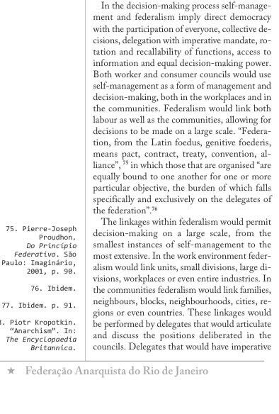 A libertarian socialist/communist framework typically utilizes decentralized planning to ensure that everyone’s needs are met. Whether for shared infrastructure, fair distribution of goods, or complex production chains, such projects require broad coordination. "In the new system of production, the functions of organization will devolve upon specially-created agencies, purpose-built by the working masses: workers' councils or workers' administrations of factories and plants. These agencies, liaising with one another at the level of municipality, province and then country, will make up the municipal, provincial and thereafter general (federal) institutions for the management and administration of production." When it comes to a complex division of labor, for example the production of a tram, the affected industries in the supply chain could decide to send delegates to a higher-level council in the federation to manage coordination and to find common solutions. Delegates convey the affected council's proposal to a wider assembly, comprised of delegates from various groups within the federation. These delegates, unlike representatives, hold no personal power, they carry out council decision or tasks, following a specific mandate and can be recalled at any time if they act against the will of the base. Mandates, directly voted on, provide guidelines or instructions delegates must follow, keeping them accountable. At a higher level council, delegates sent from the base level engage in discussions to synthesize positions and develop proposals that reflect the will of participating commune/workers councils. The outcomes are then shared back with the base councils along with explanations and any implications for review and amendments. If amendments are proposed, they are sent back up the federative structure for consideration. This iterative process ensures that the final decision is as participatory and inclusive as possible. The final ratification always rests with the base level, since in a horizontal federation power belongs collectively to all individuals, not representatives. "We consider the working people capable of building, on their own and without parties, commissars or generals, their own free soviet system, in which those who are elected to the Councils will not command and order us but on the contrary, will be only the executors of the decisions made in our workers' gatherings and conferences" The system works by balancing higher-level councils with the autonomy of lower ones and the direct decision-making on the base instead of representatives. "The council system when purely applied, creates no sort of bureaucracy, no special claim on the part of individuals, no comprehensive absoluteness of power." Because as an organizational model, the council system is fundamentally federalist. "Only a federalistic social organization, supported by the common interest of all, can free us from the curse of the political machine." The federalist idea also leads logically to internationalism, that is to say, the organization of nations on a federal basis into the large, free union of mankind. "True internationalism rests on self-determination, following Proudhon, Bakunin propounded that each individual, each association, commune, or province, each region and nation, has the absolute right to determine its own fate, to associate with others or not"